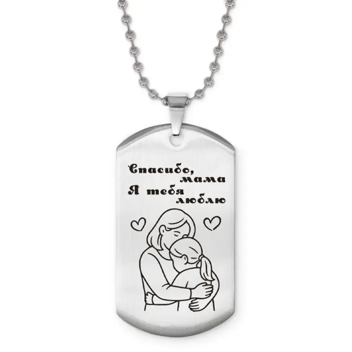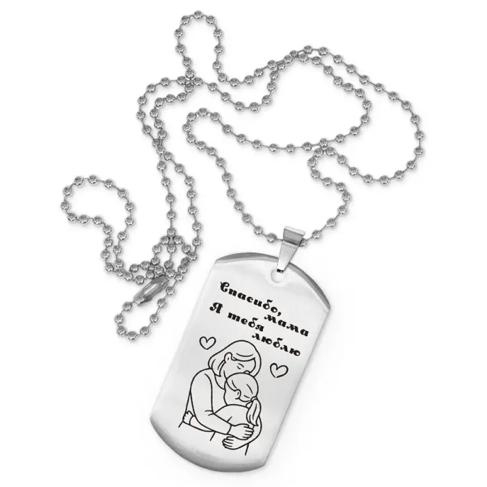 Жетон на цепочке с гравировкой «Спасибо мама». Изготовлен из полированной нержавеющей стали.