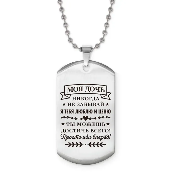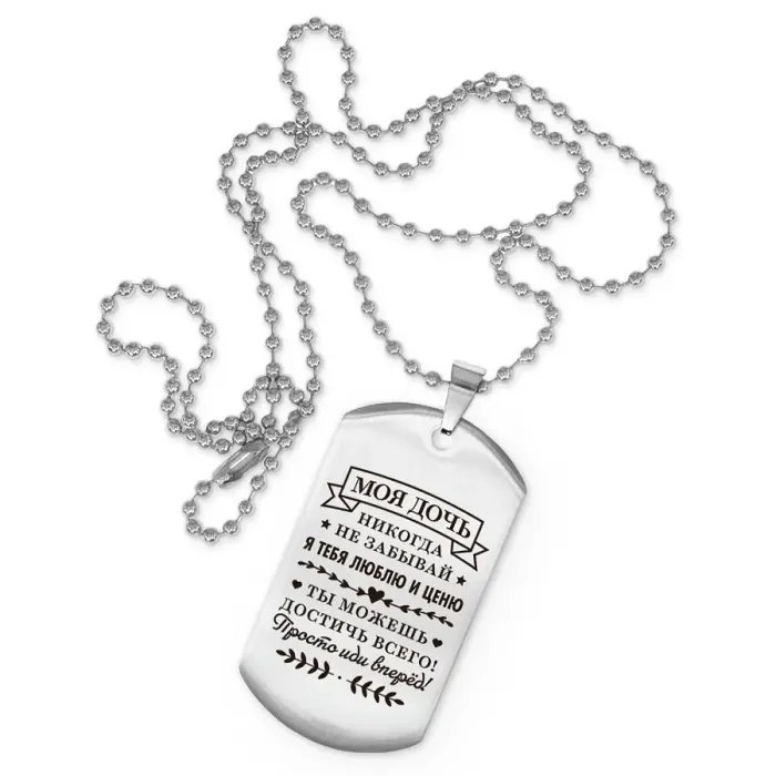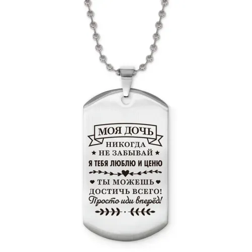 Сувенирный жетон на цепочке с гравировкой «Моя дочь». Изготовлен из полированной нержавеющей стали.