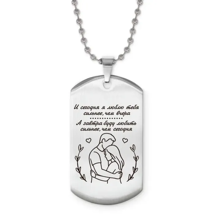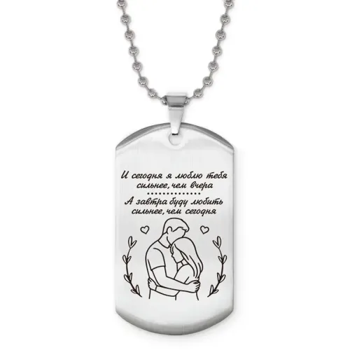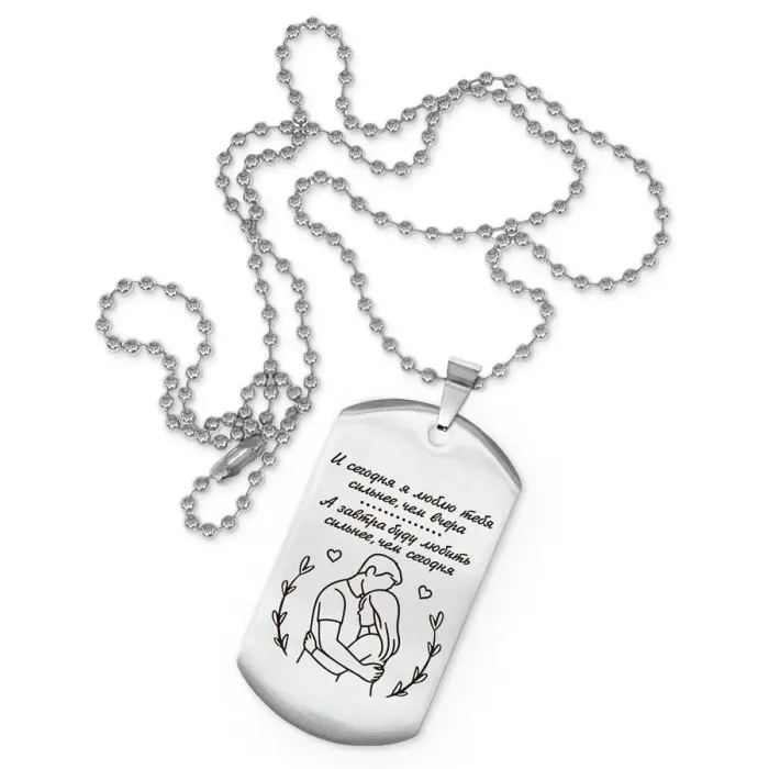 Жетон на цепочке с гравировкой «Сегодня я люблю тебя». Изготовлен из полированной нержавеющей стали.