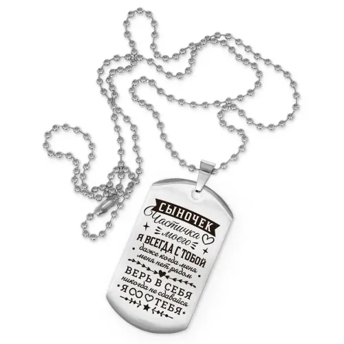 Жетон на цепочке с гравировкой «Сыночек частичка сердца моего». Изготовлен из полированной нержавеющей стали.