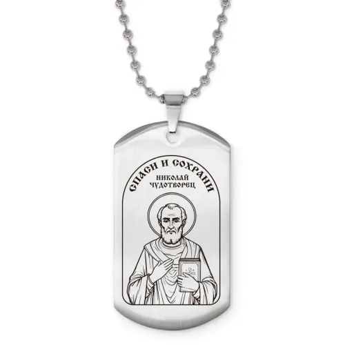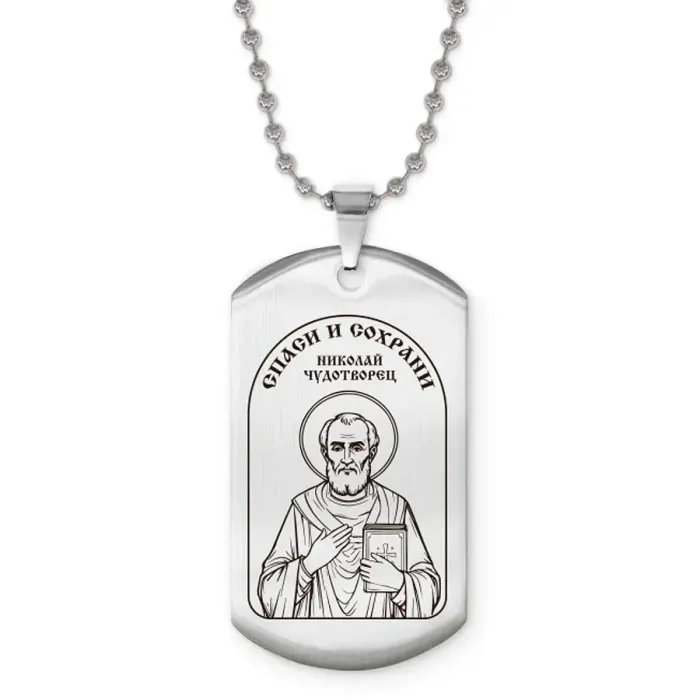 Жетон на цепочке с изображением Николая Чудотворца. Изготовлен из полированной нержавеющей стали, гравировка нанесена на одну сторону.
