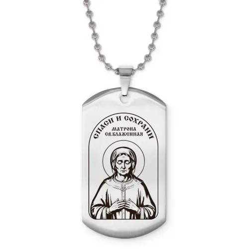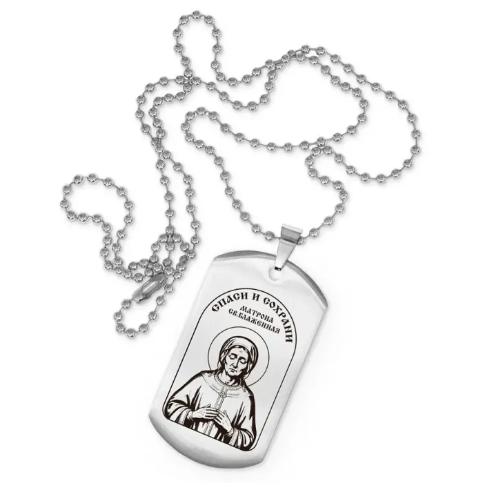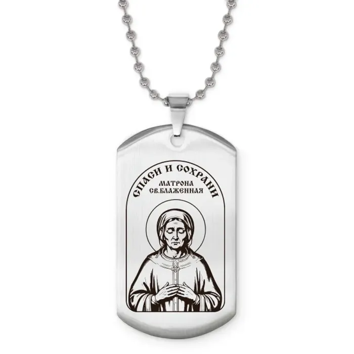 Жетон на цепочке с изображением Матроны Блаженной. Изготовлен из полированной нержавеющей стали с гравировкой на одной стороне.