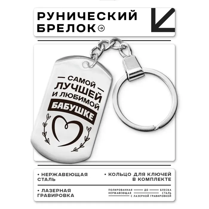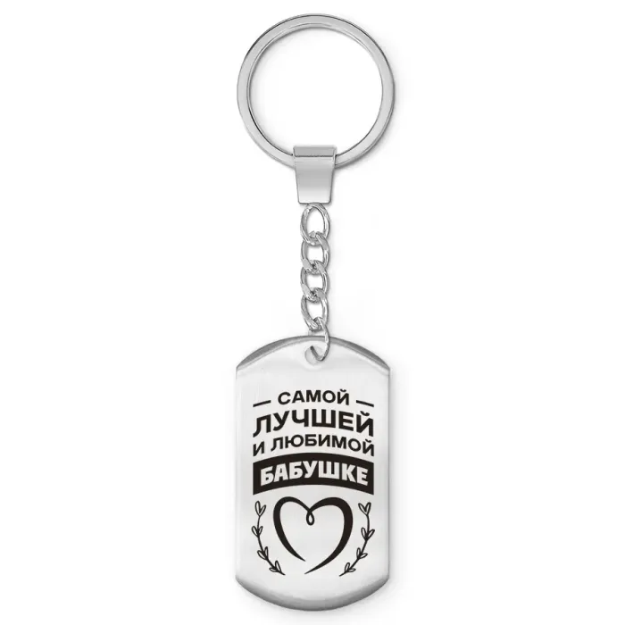 Брелок-жетон с гравировкой «Самой любимой бабушке». Изготовлен из полированной нержавеющей стали.