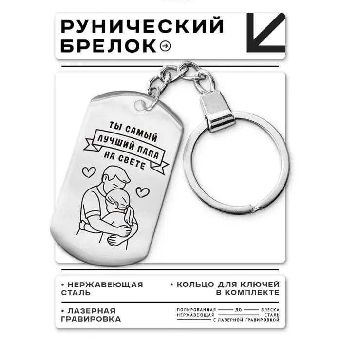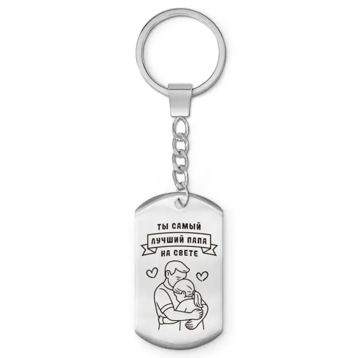 Брелок-жетон «Самый лучший папа» из полированной нержавеющей стали с гравировкой изображения.