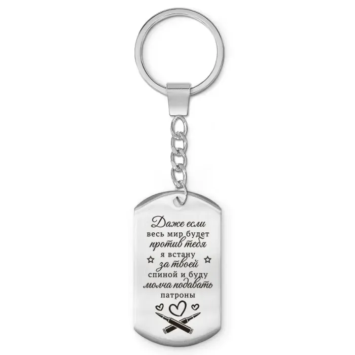 Размеры и комплектация: Размер жетона 50х28 мм. Комплектуется кольцом для ключей на цепочке. Упаковка — прозрачный пакет.