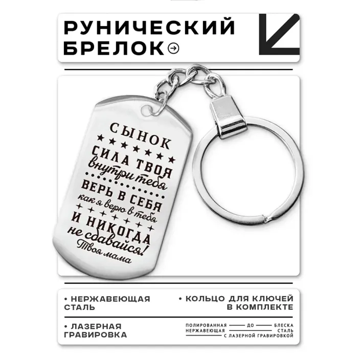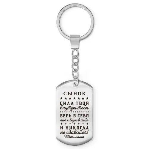 Брелок-жетон «Сынок сила внутри тебя». Изготовлен из полированной нержавеющей стали, имеет гравировку изображения.