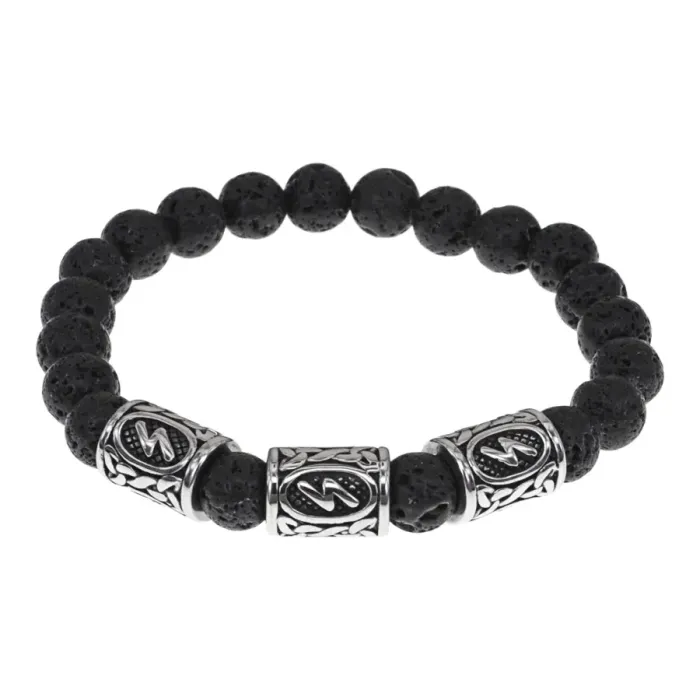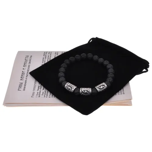 Материал и изготовление: Натуральный камень лава (базальт) диаметром 8 мм, рунические бусины из нержавеющей стали. Ручная работа.