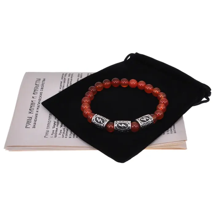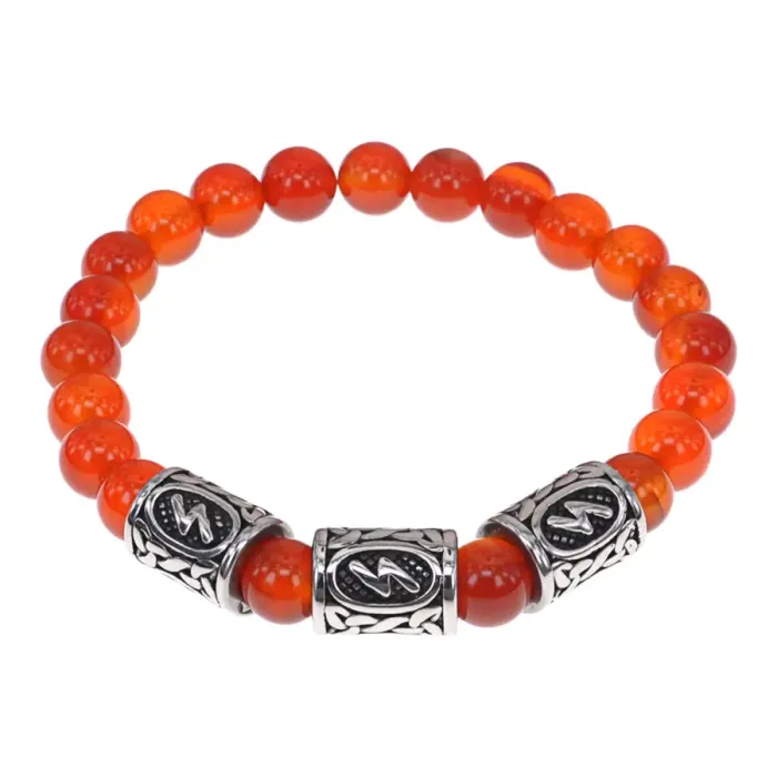 Славянский стрейч-браслет ручной работы из натурального сердолика и бусин из нержавеющей стали с руническим узором.