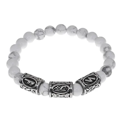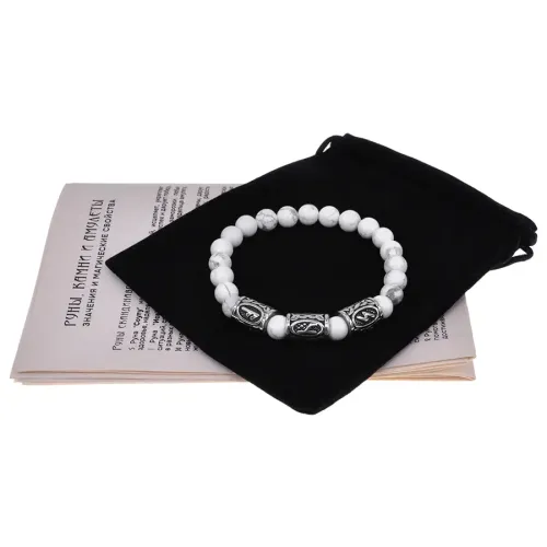 Материал и изготовление: Натуральный камень кахолонг диаметром 8 мм, бусины из нержавеющей стали с рунами. Изготовлен вручную.
