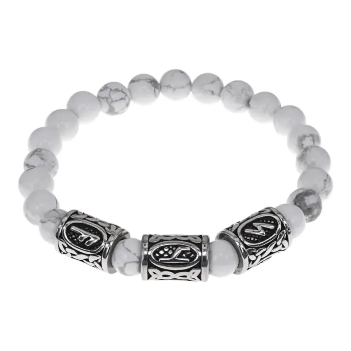 Славянский стрейч-браслет ручной работы из натурального камня кахолонг и бусин из нержавеющей стали с руническим узором.