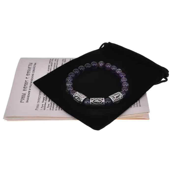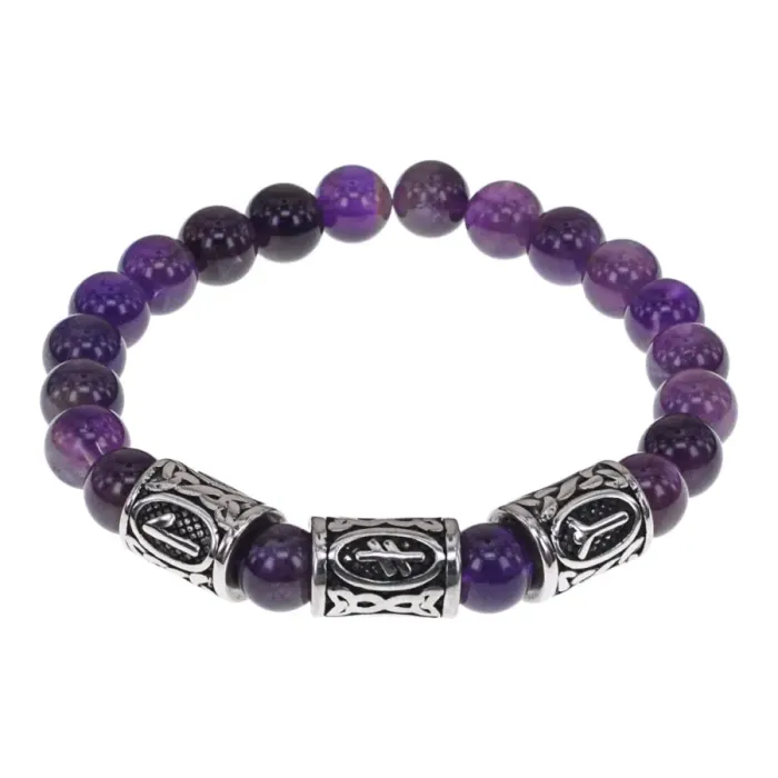 Славянский стрейч-браслет ручной работы из натурального аметиста и бусин из нержавеющей стали с руническим узором.
