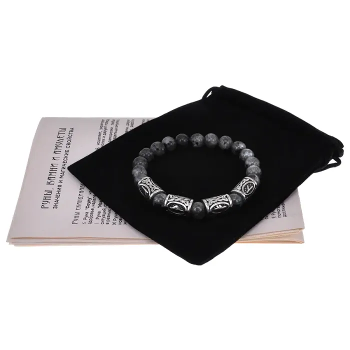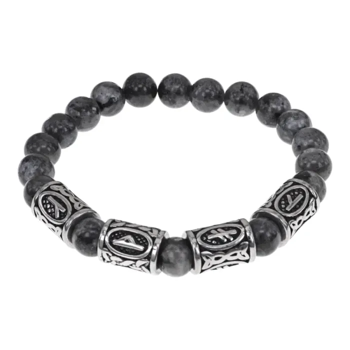Славянский стрейч-браслет ручной работы из натурального камня лабрадор и рунических бусин из нержавеющей стали.