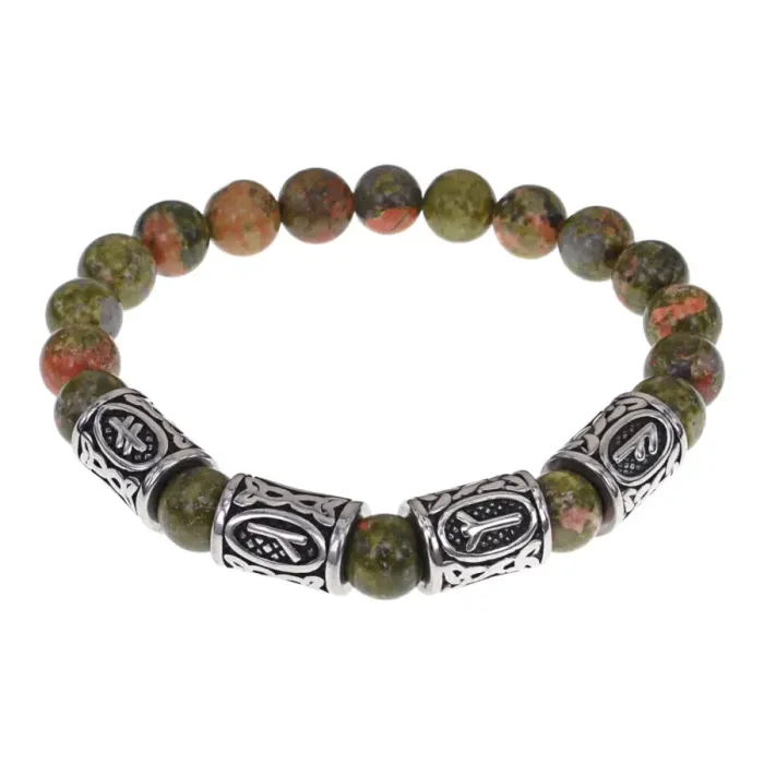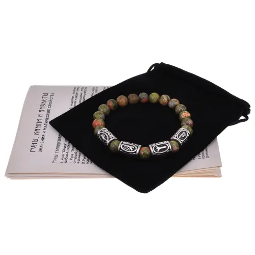 Славянский стрейч-браслет ручной работы из натурального камня унакит и бусин из нержавеющей стали с руническим узором.