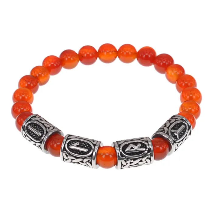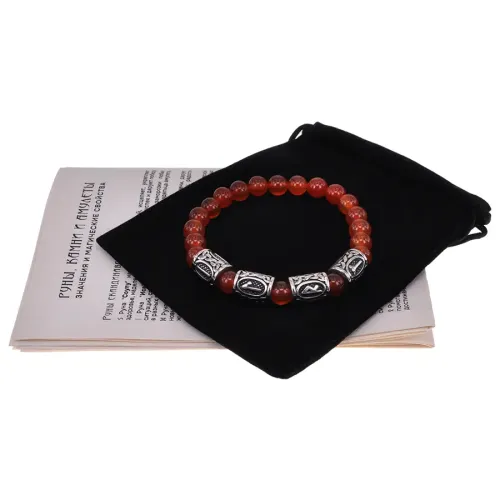 Славянский стрейч-браслет ручной работы для ношения в качестве сувенира или аксессуара. Изготовлен из натурального сердолика и бусин из нержавеющей стали с руническим узором.