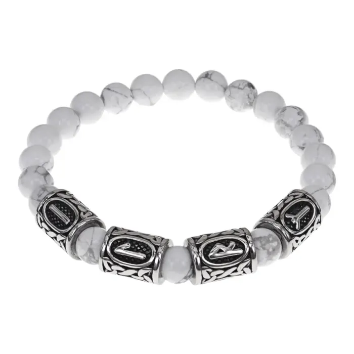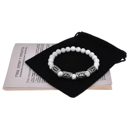 Славянский стрейч-браслет ручной работы из натурального камня кахолонг и бусин из нержавеющей стали с руническим узором.
