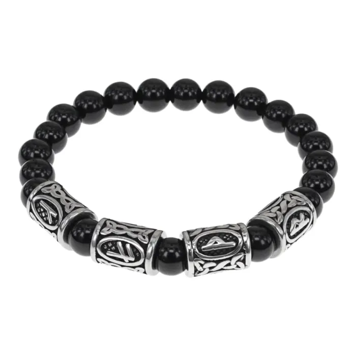 Славянский стрейч-браслет ручной работы из натурального черного агата диаметром 8 мм и рунических бусин из нержавеющей стали.