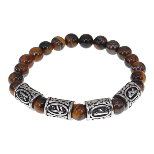 Славянский стрейч-браслет ручной работы из натурального камня тигровый глаз и бусин из нержавеющей стали с рунической символикой.