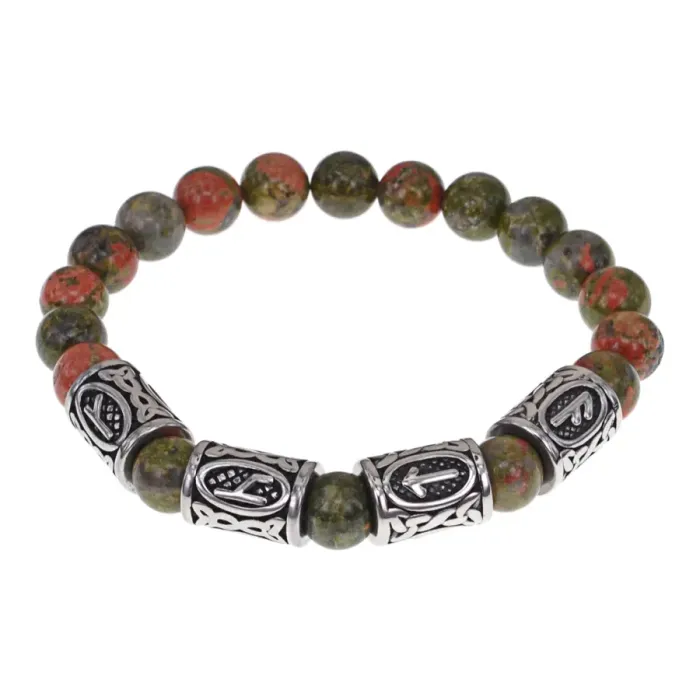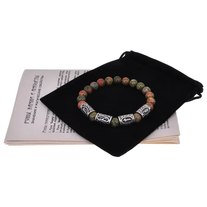 Славянский стрейч-браслет ручной работы из натурального камня унакит и бусин из нержавеющей стали с руническим узором.