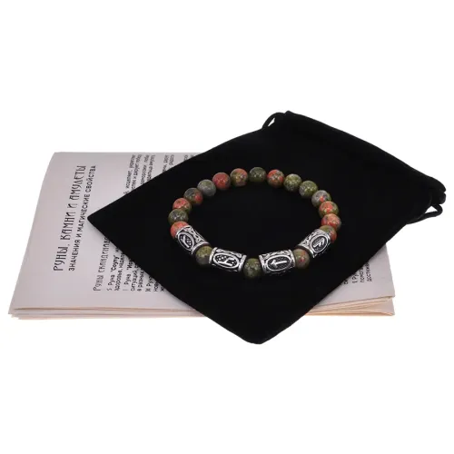 Материал и изготовление: Натуральный камень унакит диаметром 8 мм, бусины из нержавеющей стали с нанесёнными рунами. Изготовлен вручную.