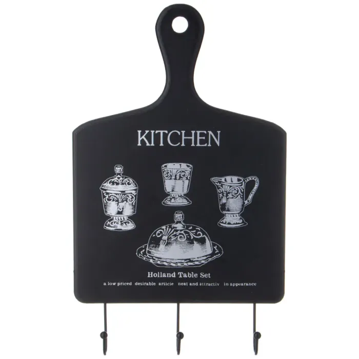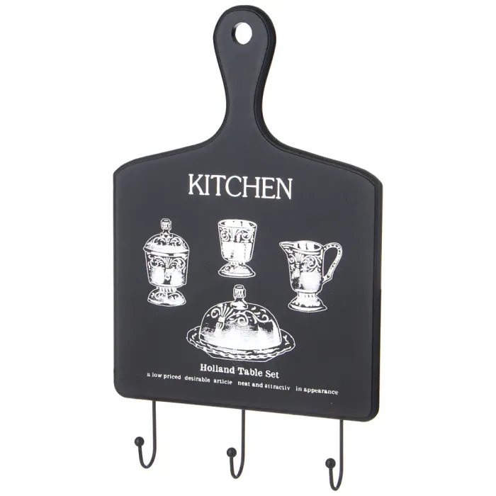 Конструкция вешалки изготовлена из прочного металла и МДФ, что обеспечивает устойчивость и долговечность при эксплуатации. Компактные габариты изделия позволяют разместить его на ограниченном пространстве кухонной стены или боковой поверхности мебели.