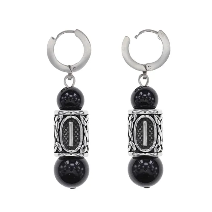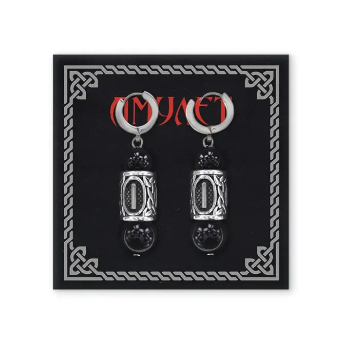 Серьги-амулеты с руническими бусинами Иса из нержавеющей стали и черного агата.