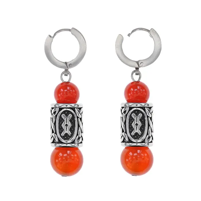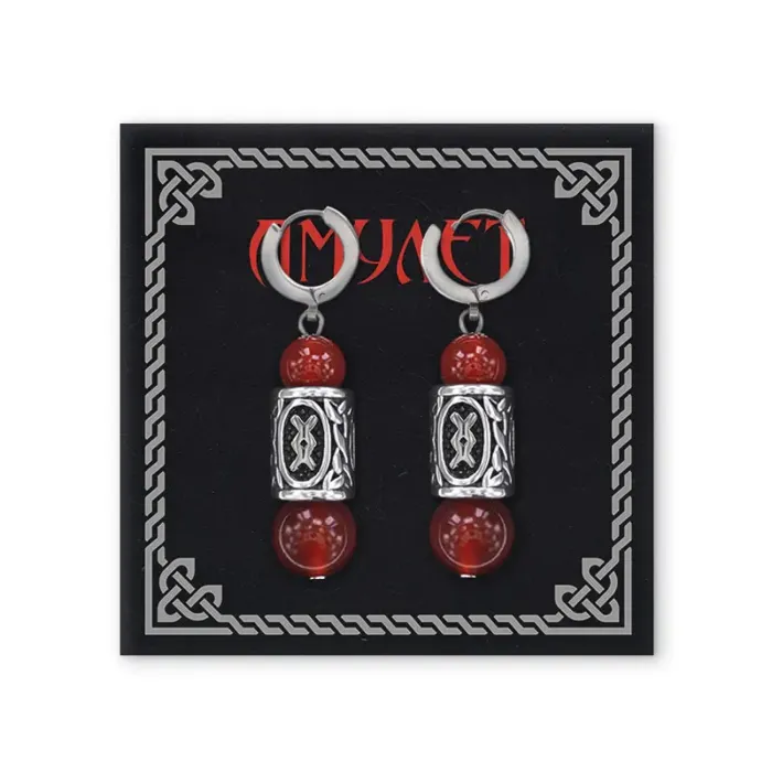 Серьги-амулеты с руническими бусинами Ингуз из нержавеющей стали и натурального сердолика.