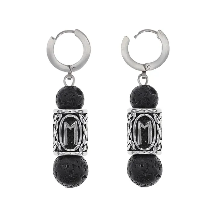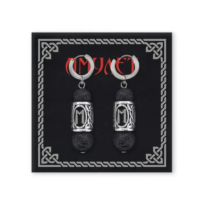 Серьги-амулеты из нержавеющей стали с бусинами из камня лава и руническим символом Эваз.