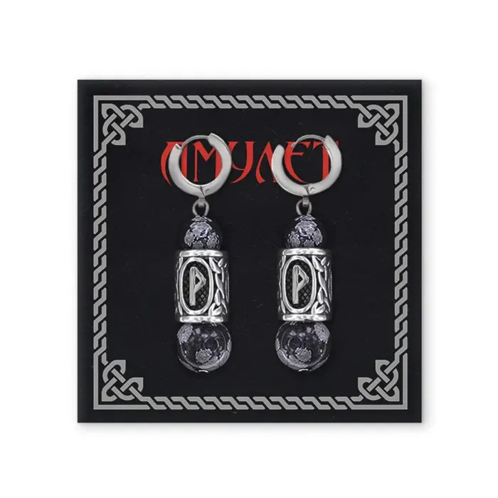 Серьги-амулеты с руной из нерж.стали Турисаз, Обсидиан SERX01-17