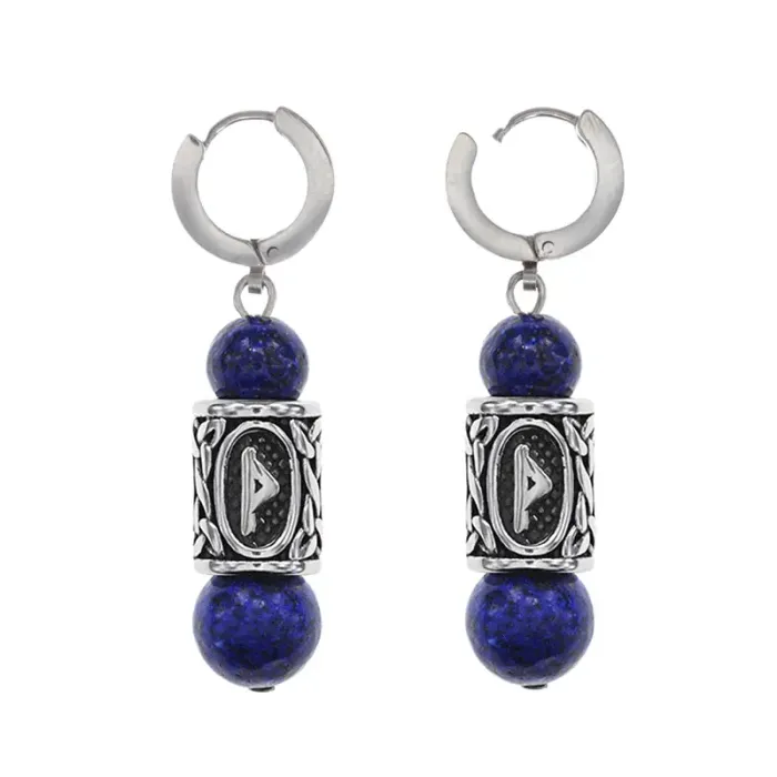 Серьги-амулеты из нержавеющей стали с руническими бусинами Турисаз и натуральным лазуритом.