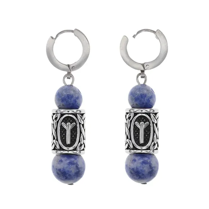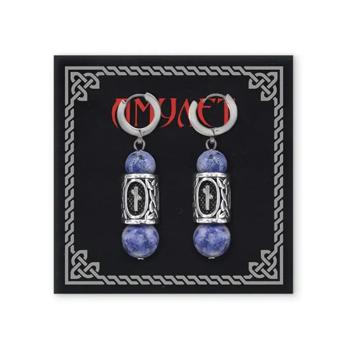 Серьги-амулеты с руническими бусинами Альгиз из нержавеющей стали и натурального камня содалит.