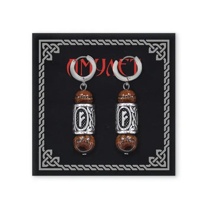 Серьги-амулеты с руническими бусинами Феху из нержавеющей стали и натурального камня.