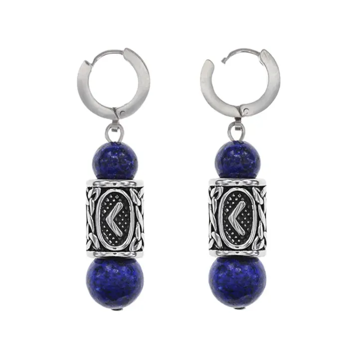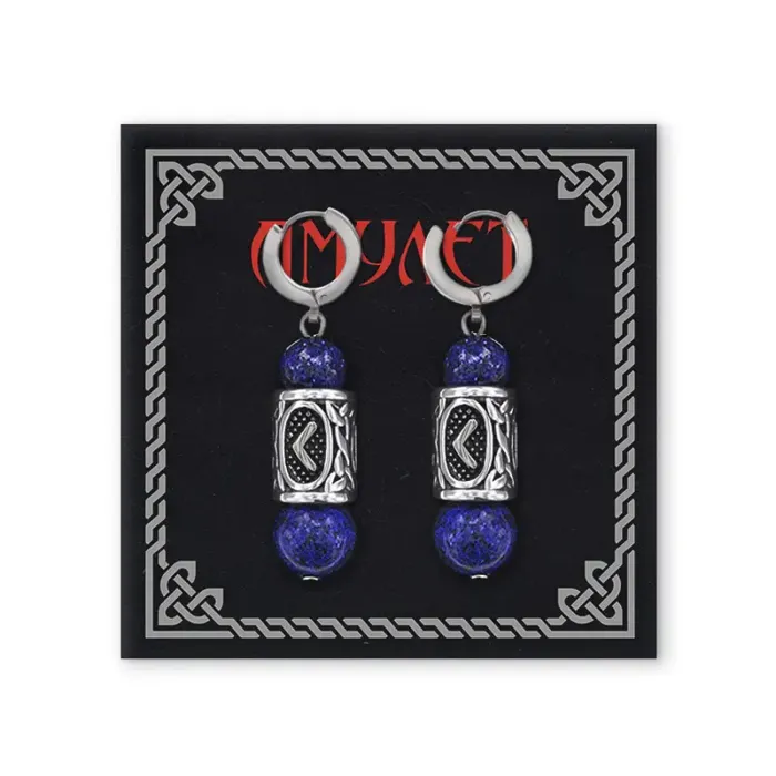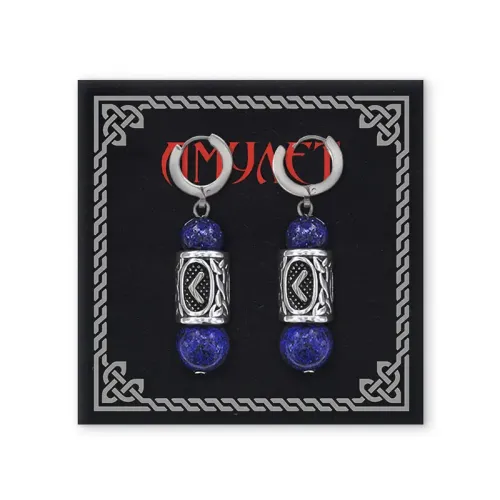 Серьги-амулеты с руническими бусинами Кеназ из нержавеющей стали и лазурита.