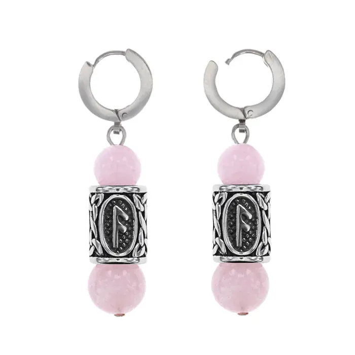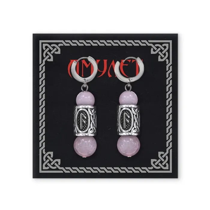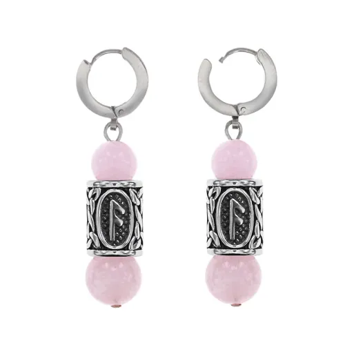 Серьги-амулеты с руническими бусинами Ансуз из нержавеющей стали и натурального розового кварца.