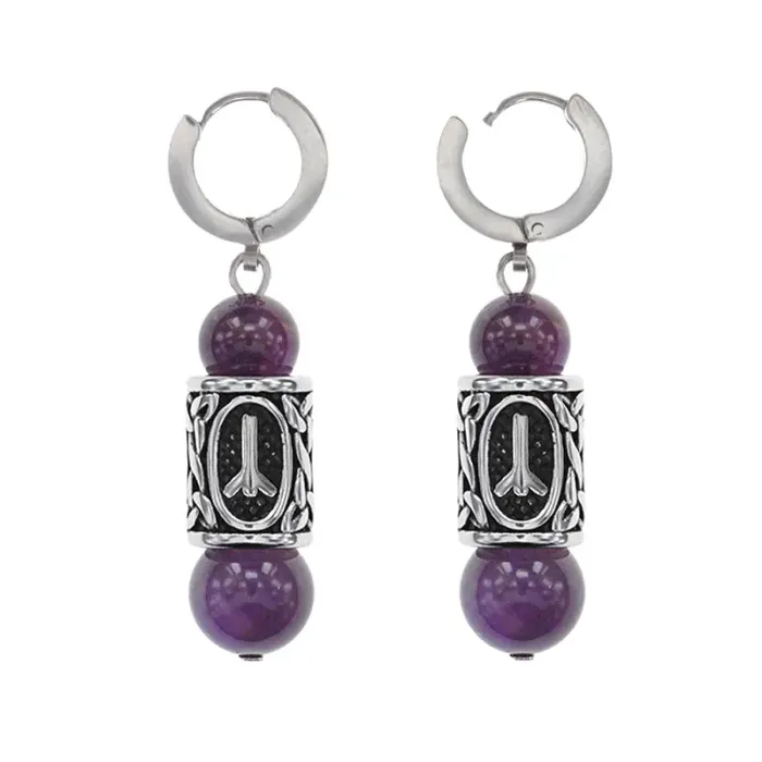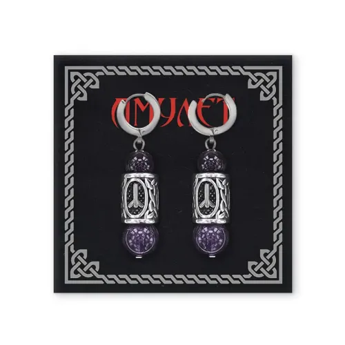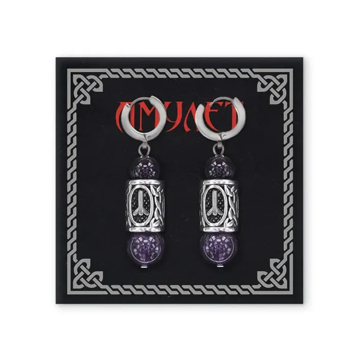 Серьги-амулеты с руническими бусинами Чернобог из нержавеющей стали с натуральным аметистом.