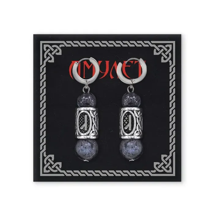 Серьги-амулеты из нержавеющей стали с руническими бусинами Алатырь и натуральным камнем Лабрадор.