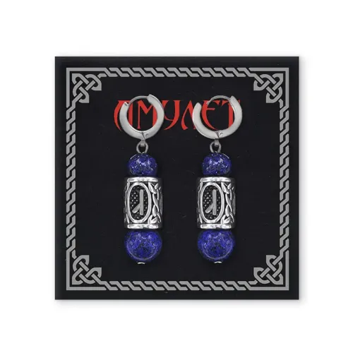Серьги-амулеты с руническими бусинами Алатырь из нержавеющей стали с натуральным лазуритом.