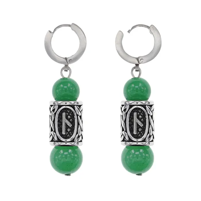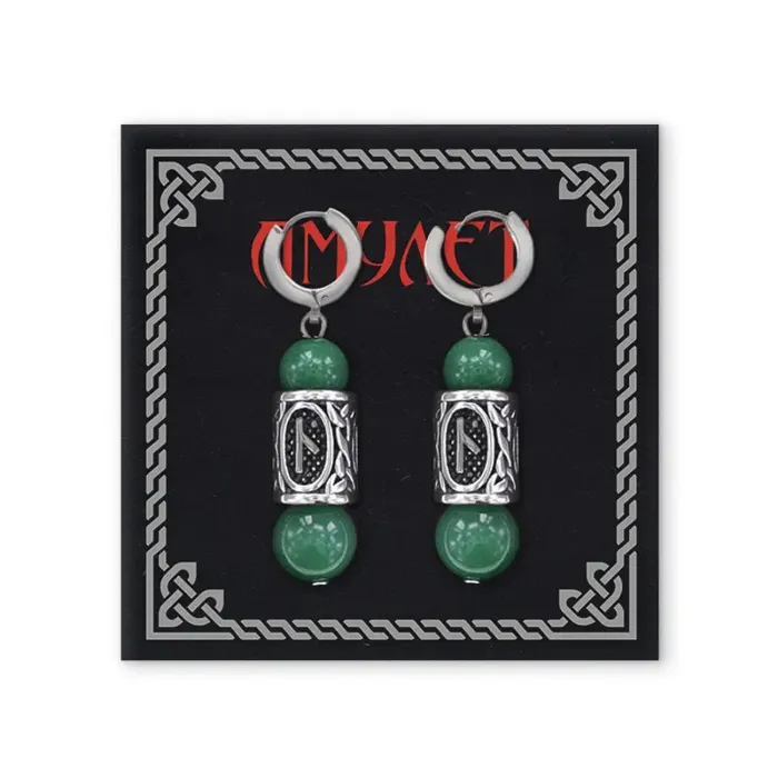 Серьги-амулеты из нержавеющей стали с бусинами из нефрита и руническим символом.