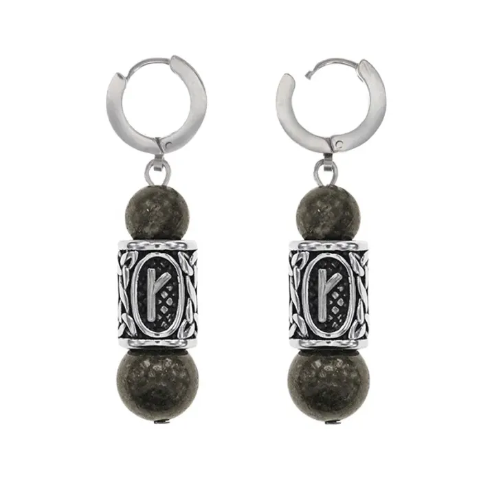 Серьги-амулеты с руническими бусинами из нержавеющей стали и натурального унакита.