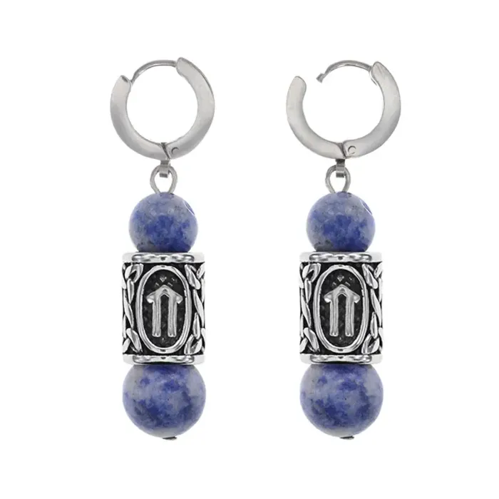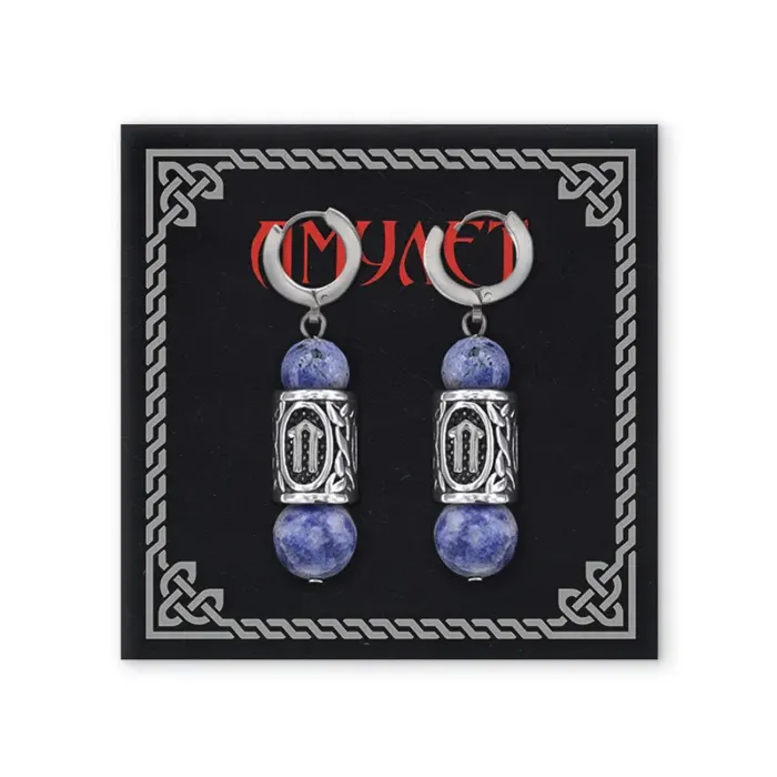 Серьги-амулеты с руническими бусинами из нержавеющей стали и натурального камня содалит.