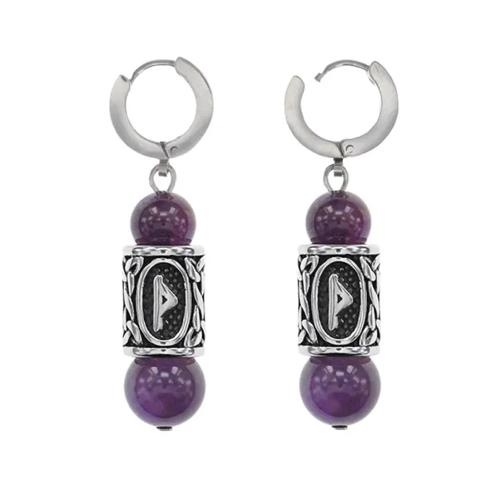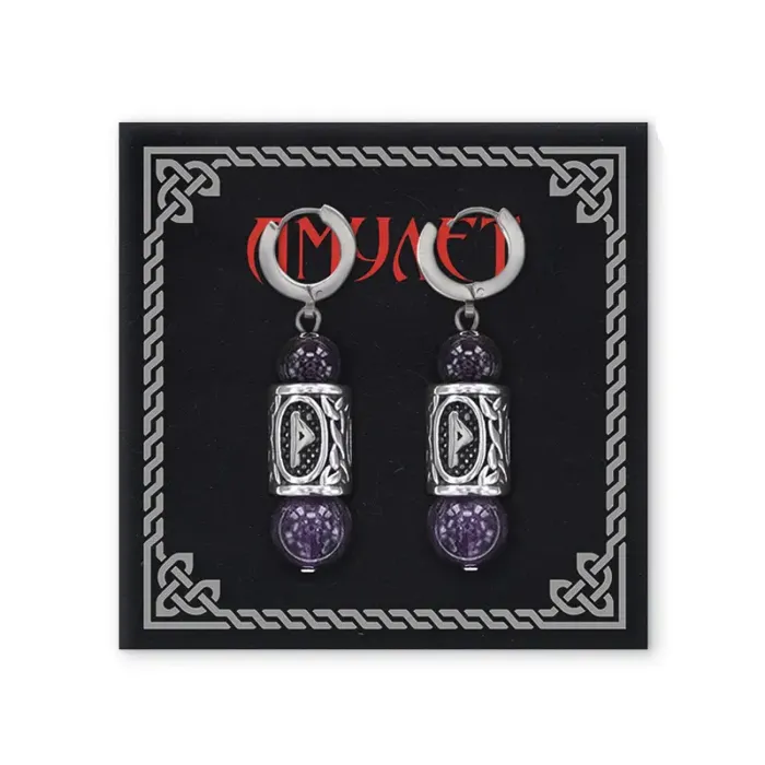 Серьги-амулеты из нержавеющей стали с руной Даждьбог и бусинами из натурального аметиста.