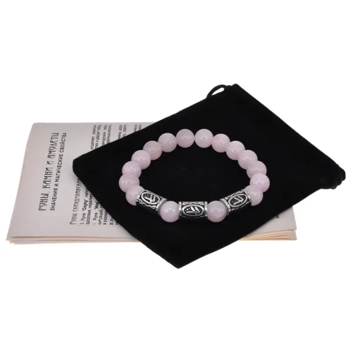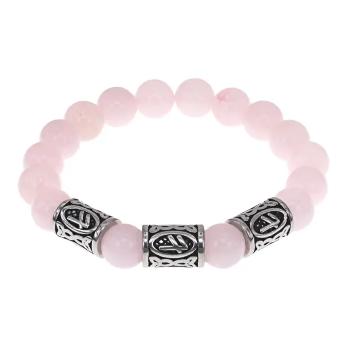 Славянский стрейч-браслет ручной работы из натурального розового кварца диаметром 10 мм и рунических бусин из нержавеющей стали.