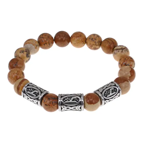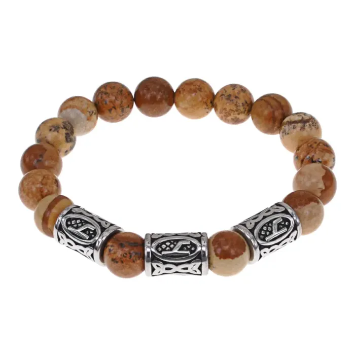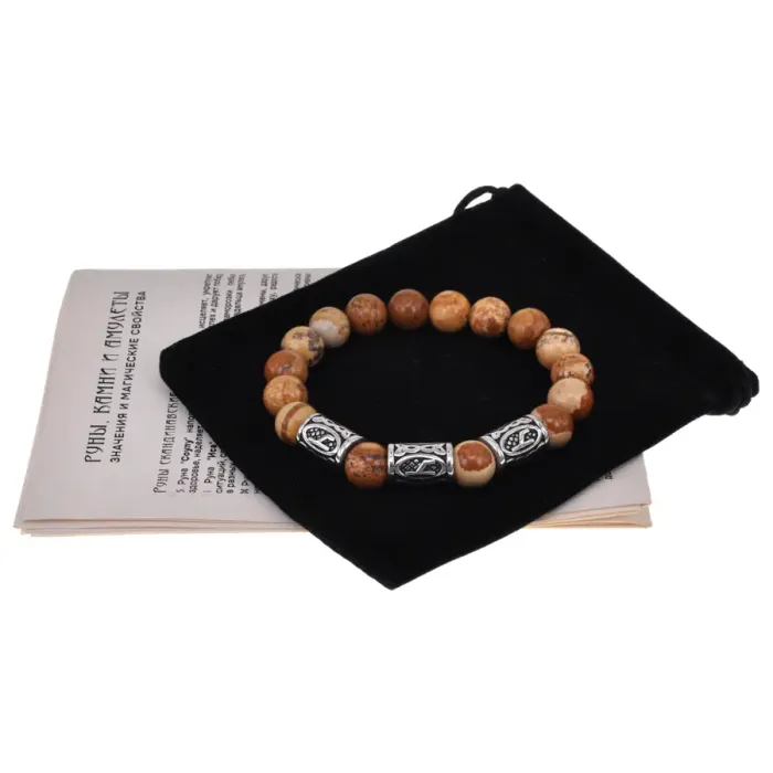 Славянский стрейч-браслет ручной работы из натуральной песочной яшмы и бусин из нержавеющей стали с руническим узором.