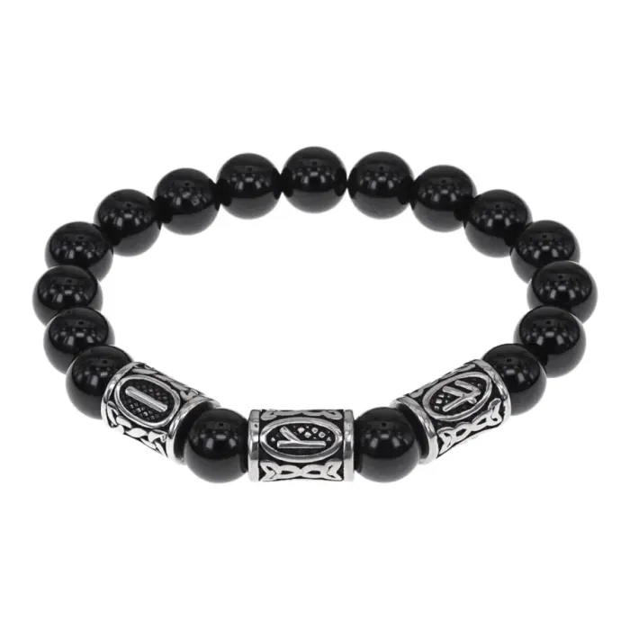 Славянский стрейч-браслет ручной работы из натурального черного агата и бусин из нержавеющей стали с рунической символикой.