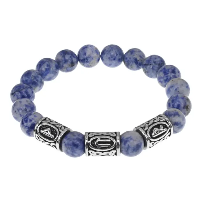 Славянский стрейч-браслет ручной работы из натурального камня содалит и бусин из нержавеющей стали с руническим узором.