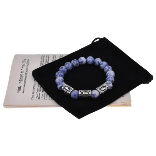 Материал и изготовление: Натуральный камень содалит (бусины 10 мм), бусины из нержавеющей стали с нанесёнными рунами. Изготовлен вручную.