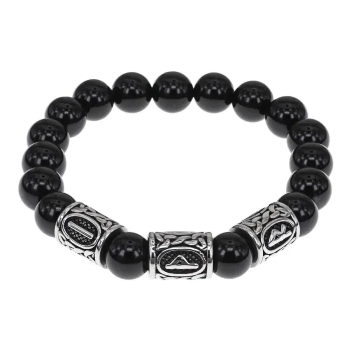 Славянский стрейч-браслет ручной работы из натурального черного агата и бусин из нержавеющей стали с руническим дизайном.