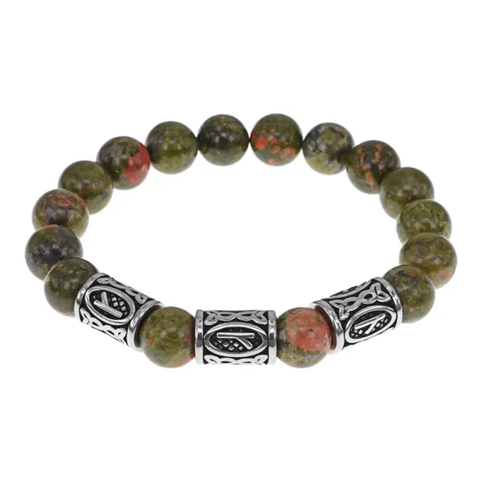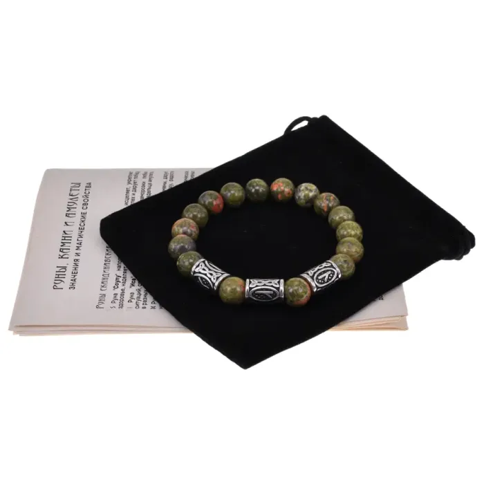 Славянский стрейч-браслет ручной работы из натурального камня унакит и бусин из нержавеющей стали с руническим орнаментом.