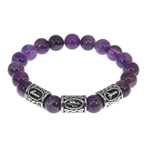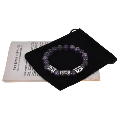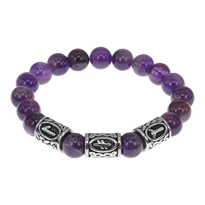 Славянский стрейч-браслет ручной работы из натурального аметиста и бусин из нержавеющей стали с руническим узором.