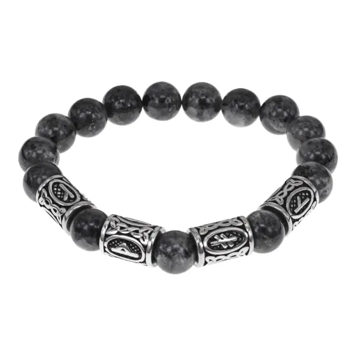 Славянский стрейч-браслет ручной работы из натурального камня лабрадор и бусин из нержавеющей стали с рунической формулой.