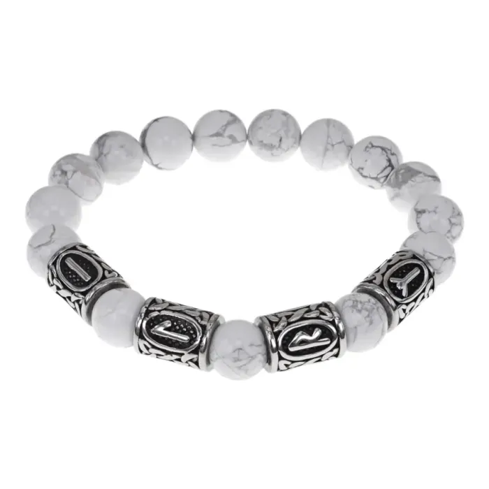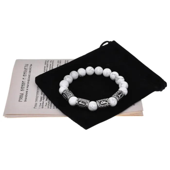 Славянский стрейч-браслет ручной работы из натурального камня кахолонг диаметром 10 мм с руническими бусинами из нержавеющей стали.